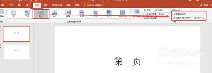 给第一页设置自动切换格式:选择“切换”菜单,选择一种切换方式。设置“换片方式”,把单击鼠标时前的对勾取消,并勾选”设置自动换片时间“的勾,设置时间”00.02.00“。