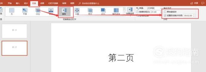 同理,给第二页设置自动切换格式:选择“切换”菜单,选择一种切换方式。设置“换片方式”,把单击鼠标时前的对勾取消,并勾选”设置自动换片时间“的勾,设置时间”00.02.00“。