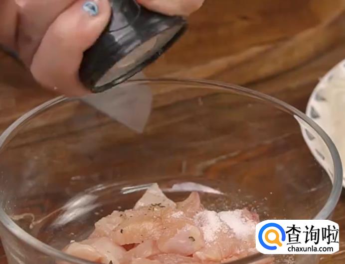 加盐、黑胡椒、和生粉在鸡胸肉上,拌匀腌制十分钟。