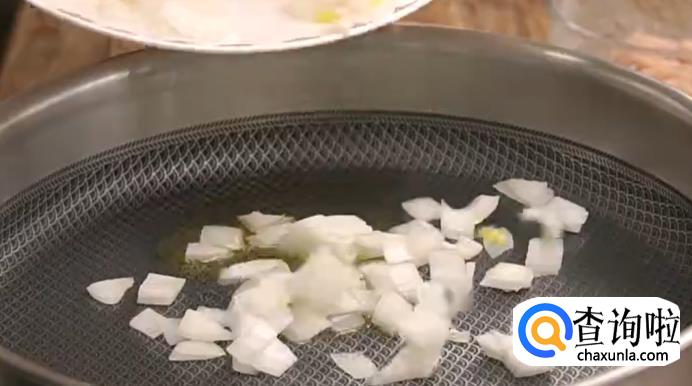 先将油倒入锅中,再放入洋葱炒香。