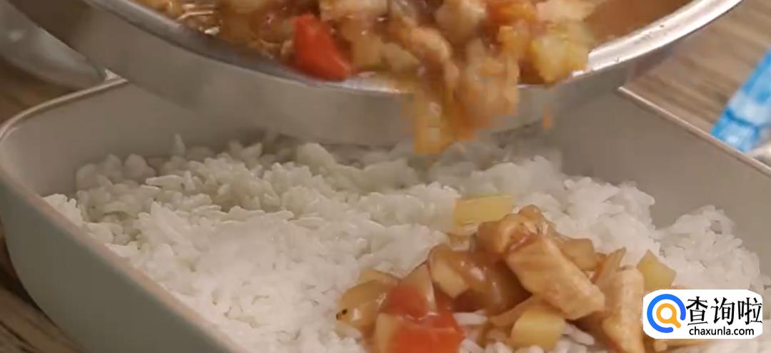 在烤盘里铺满米饭,再倒入炒好的鸡胸肉。