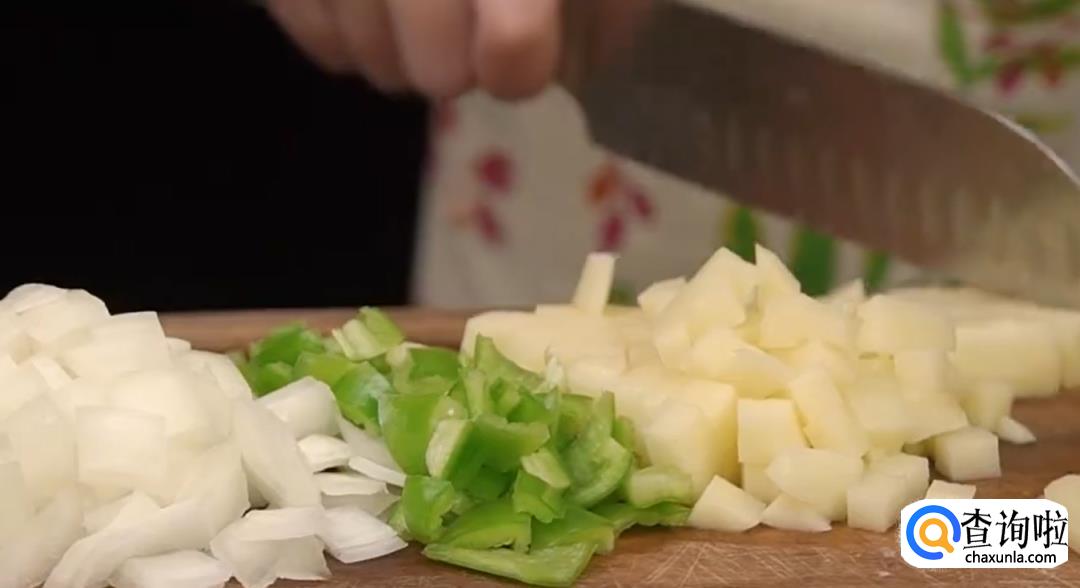 西红柿、洋葱、青椒切丁。