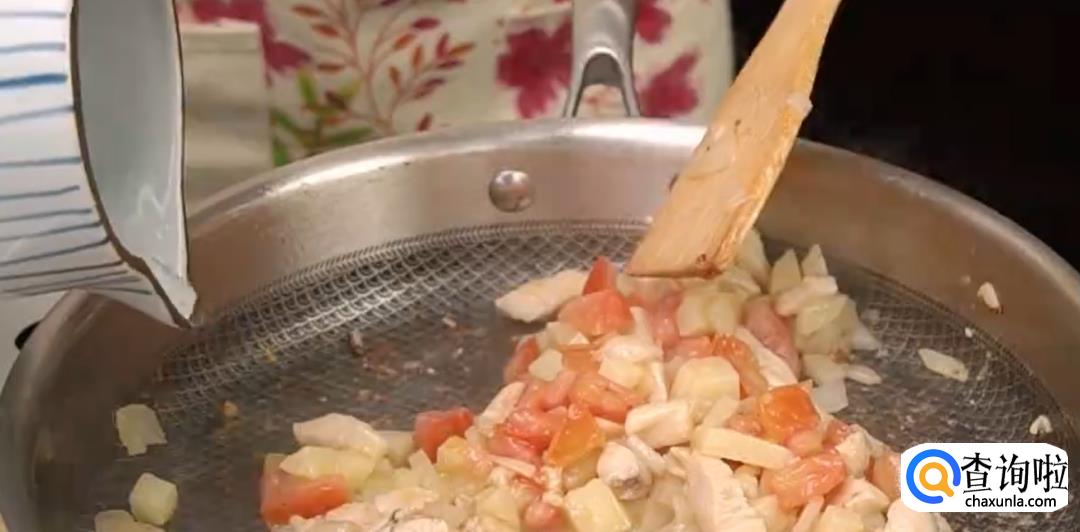 依次放入鸡胸肉,土豆,西红柿炒香。