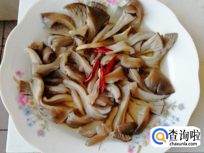 取适量蘑菇,用清水把蘑菇洗净,然后把洗净的蘑菇,用手撕成蘑菇条,撕好后让入盘中待用,干红辣椒一个,用清水洗净,切成辣椒丝,切好放在蘑菇上。