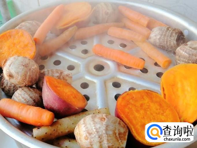 取出熟地瓜放入用容器中,取出蒸熟的胡萝卜和山药,取出蒸熟的芋头,接下来的时间,我们就可以享受美味了!多种食材一起蒸就做好了。