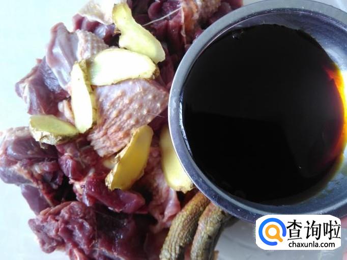 鹅肉一边,姜片适量,生抽3勺,料酒2勺,香菜适量。