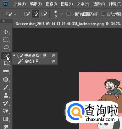 接下来,要把该图片P成透明底,即是把背景像素删除。那么,可以这样操作。在工具栏中调出快速选择工具。