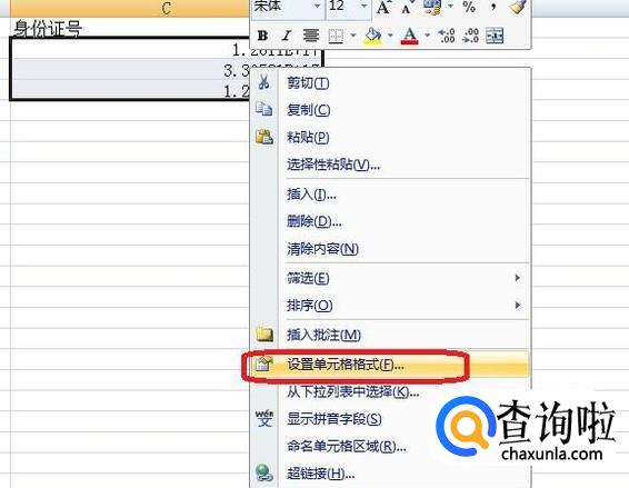 我们选中这三个有问题的单元格,如图所示,右键单击,选择“设置单元格格式”。