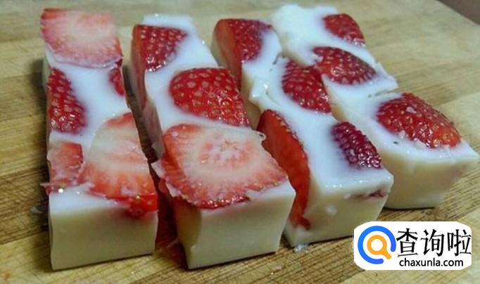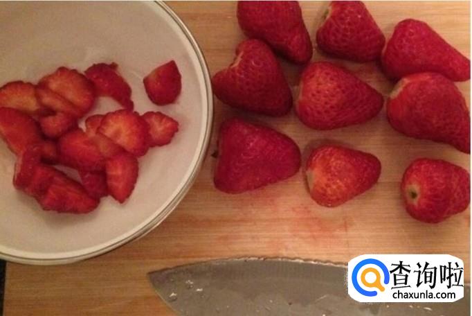 然后将草莓去蒂,再切成片,不要太薄也不要太厚。同时把吉利丁片用冷水泡软。
