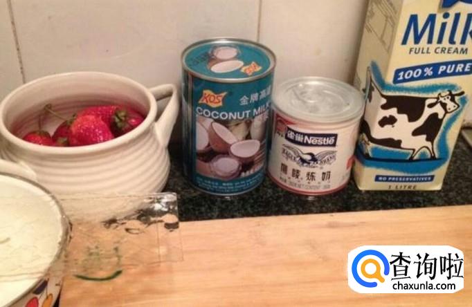 首先准备好食材,牛奶、炼奶、吉利丁片,糖,草莓,并将草莓洗干净。以及准备好装奶冻的模具,没有的话可以直接用一个塑料盒子。