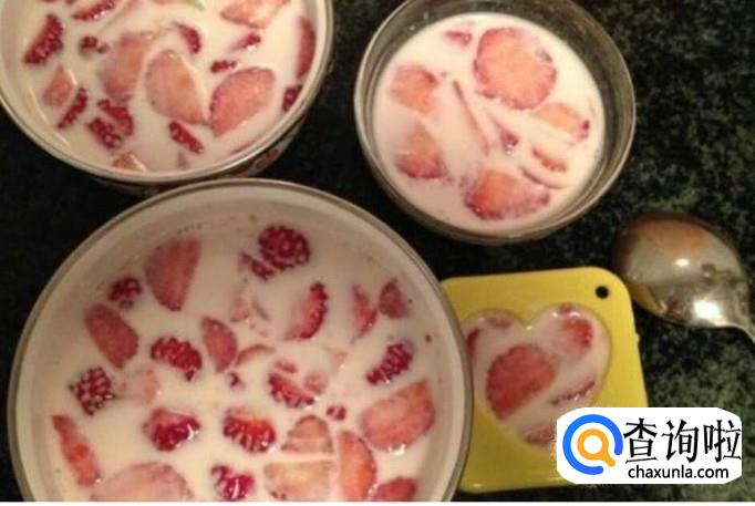 再将牛仔用小火加热,并且加入吉利丁片搅拌使其融化。将切好的草莓片加进去,如果喜欢甜一点的可以适当加入一点糖,再充分混匀。