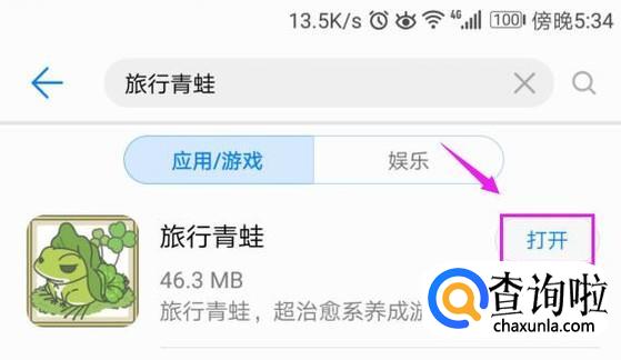 在搜索栏中输入“旅行青蛙”,点击自动出现的那个蓝色字体的,如图所示。