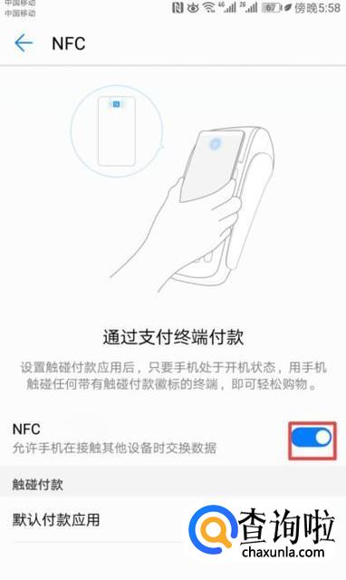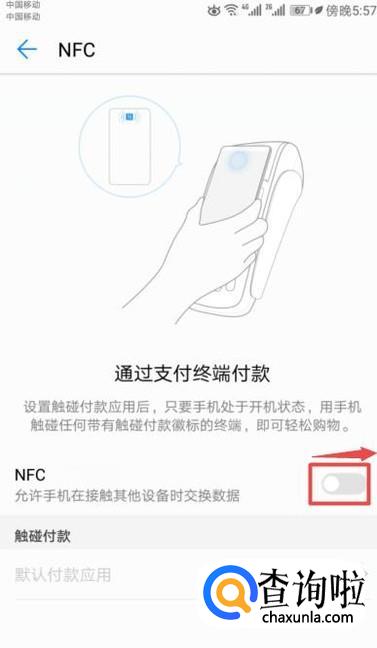 滑动完成后,如图所示,这样我们将开启了NFC功能了,之后我们将公交卡放在手机摄像头处,经过识别后,我们输入金额,然后进行支付就可以了。