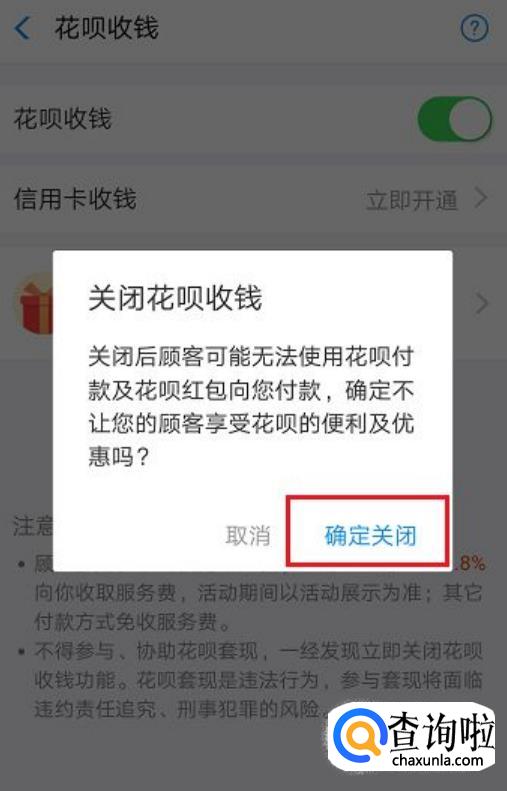 如果想要关闭,同样点击花呗收钱后面的按钮,会弹出对话框让你确实是否关闭,点击【确定关闭】,就可以了。