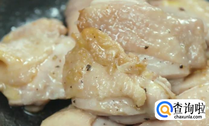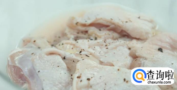 之后将去骨的鸡腿肉切成合适的大小,撒上少许的黑胡椒碎,淋上白葡萄酒,加上生粉抓匀腌15分钟。