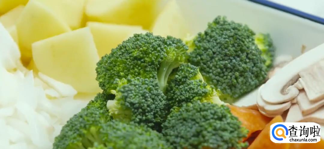 首先来处理蔬菜,胡萝卜、土豆切滚刀块,洋葱切小块,蘑菇切片,西蓝花掰成小朵焯水过凉备用。