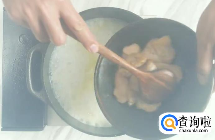 之后再加适量的盐和牛奶,煮沸后加水没过食材,大火烧开后加入鸡肉,之后转中小火炖上20分钟。
