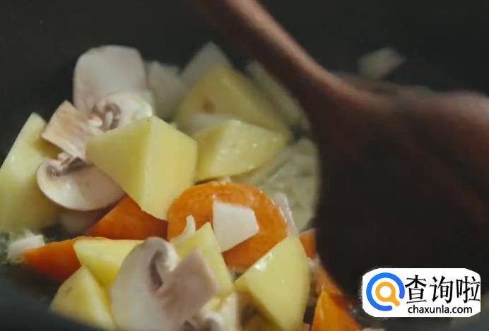 之后另起油锅,将胡萝卜、土豆、洋葱、蘑菇、炒至断生。