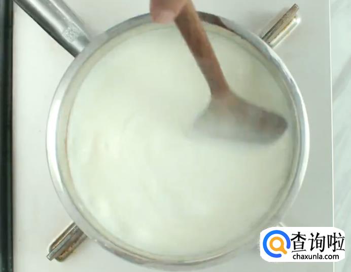 这时另起一锅加入黄油、面粉炒至融化,在泛起小泡泡的时候加入牛奶。煮沸成牛奶汁。