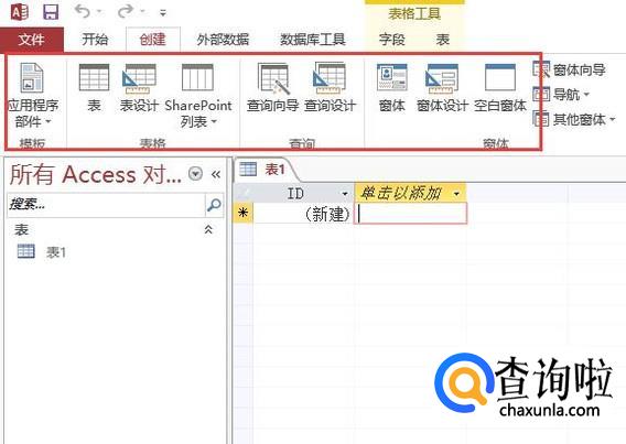 进入access主界面以后子啊顶部的创建菜单下可以选择创建的内容类型,如下图所示