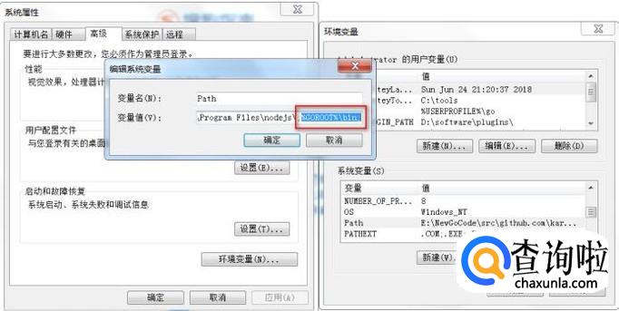 最后需要将GOROOT添加到path中,这样才能让go的可执行程序在全局可用.找到系统变量中的Path,双击之后弹出弹框,在输入框的最后面加上'%GOROOT%bin;'即可.注意如果原来最后面没有分号,需要先加上分号,点击确定->确定->确定关闭所有窗口