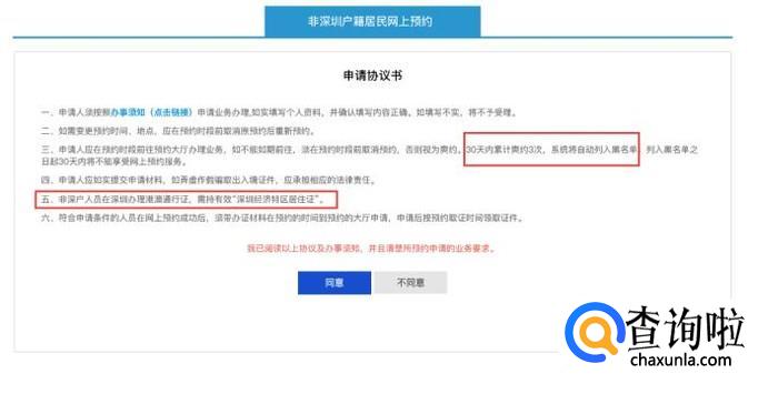 点击预约时间下一步后,新页面中出来的是“申请协议书 ”,点击同意。里面有些事项要注意。“30天内累计爽约3次,系统将自动列入黑名单”,被列入黑名单30天内不能再次在网上预约。