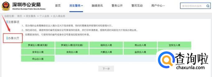 成功登录进去后,你会看到页面中列出了深圳可以办理港澳通行证的办事处,选择离家最近或者最方便的办事大厅。这里以罗湖出入境为例。