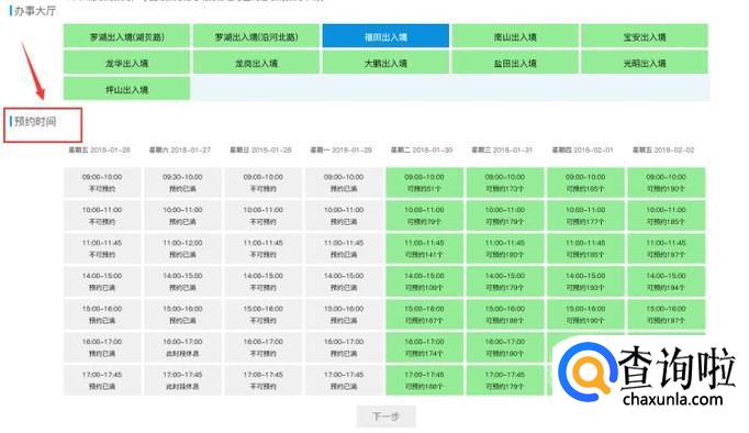 选择后会在页面的下方弹出一个页面,显示的是每天的可预约时间,与已经预约满的不可再预约时间。如果想预约周末的话,一般提前一周。我们这里随便选择一个可预约的时间,点击下一步。