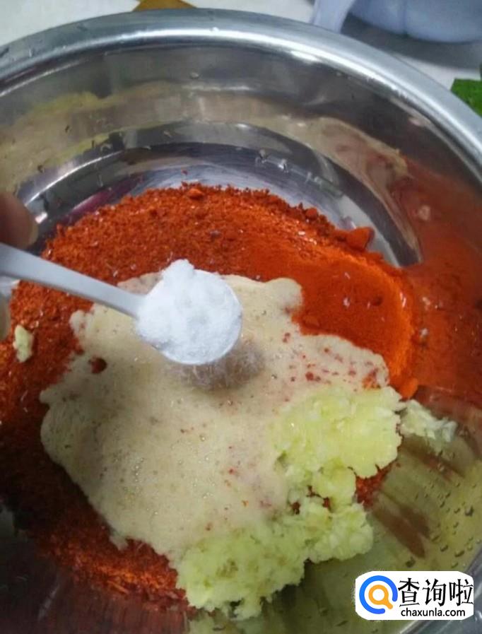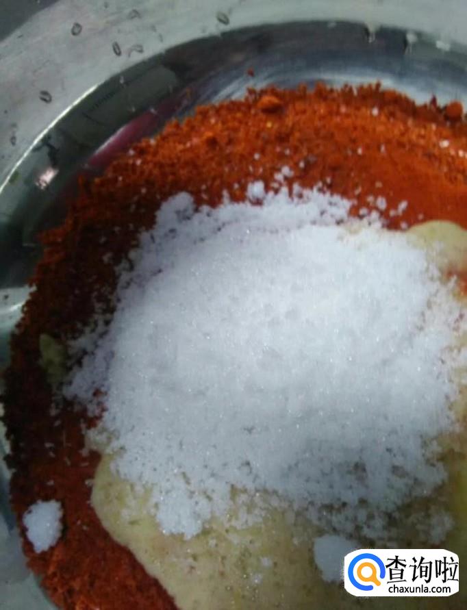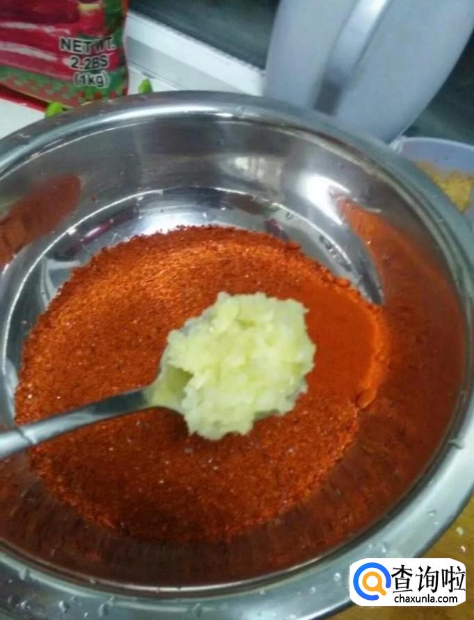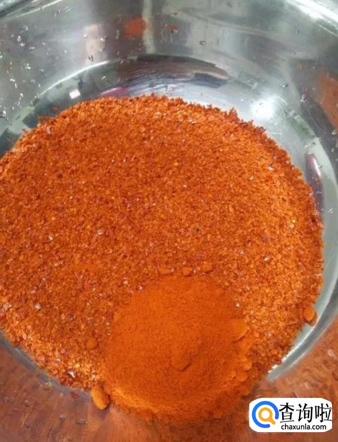 接着我们将辣椒面放入盆中,加入适量的辣椒粉,加入适量的姜蒜末。