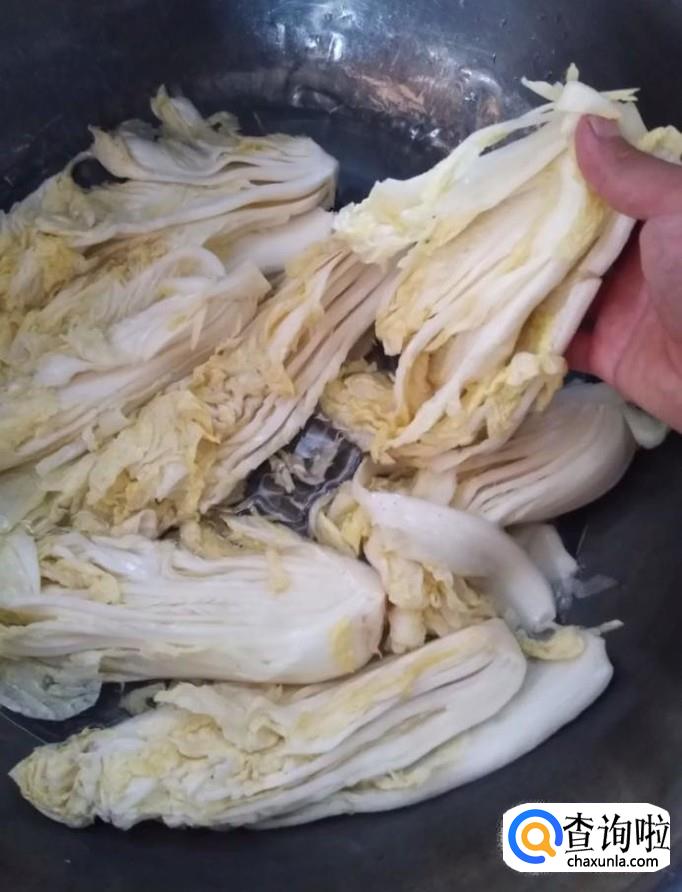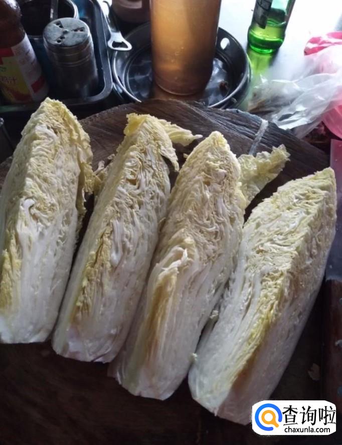 首先我们将大白菜清洗干净,一切四半,放入热水锅中焯一下捞出,加入适量的盐,腌制2个小时,攥干水分备用。