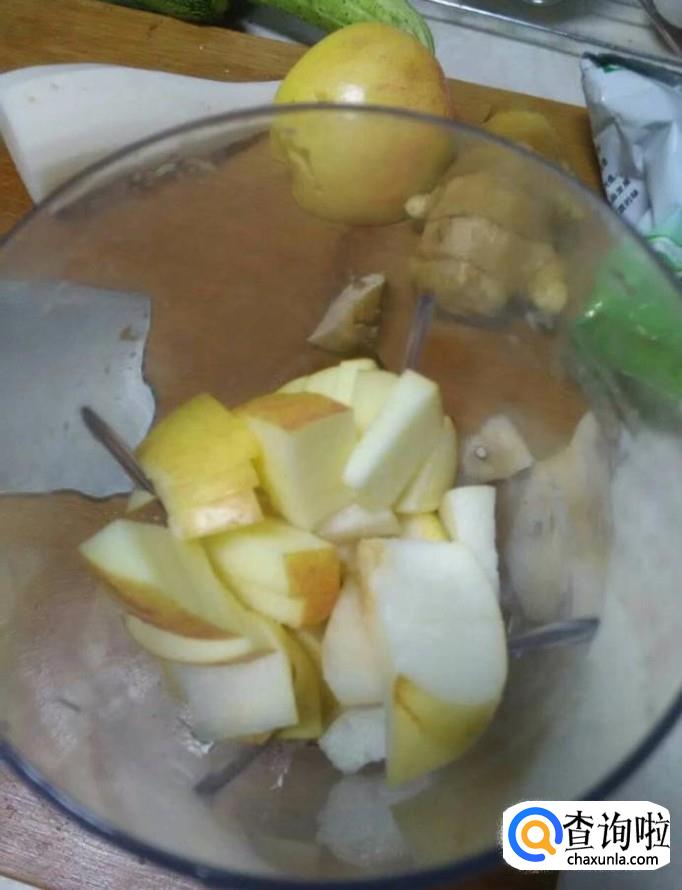 然后我们再把苹果,梨放入榨汁机榨成汁,倒入盆中。