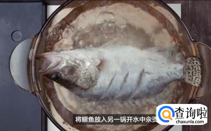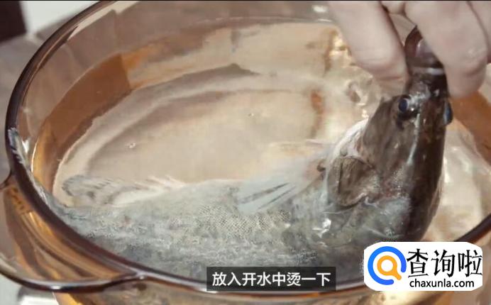 首先处理鳜鱼。将刮鳞去腮的新鲜鳜鱼放入开水中烫一下。