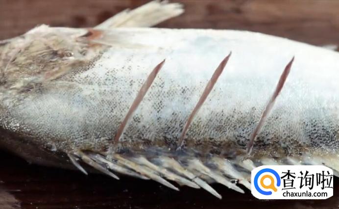 刮去表面黑色的鱼皮,在鱼身两面斜切出平行的刀口,深至鱼骨。