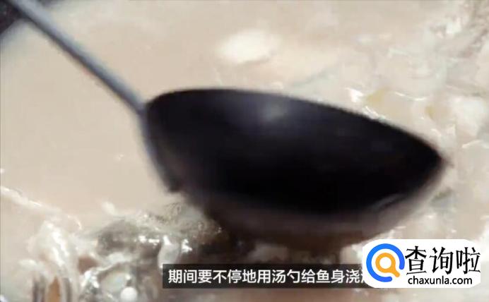 保持大火,一直煮到汤汁沸腾。期间要不停地用汤勺给鱼身浇汁。