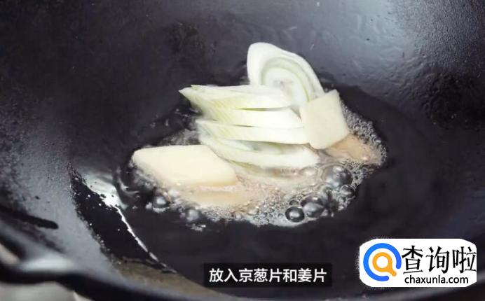 炒锅开大火,下熟猪油,放入京葱片和姜片,煸炒出香。