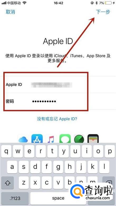 接着输入你的新的appleid和密码并点击下一步,如下图所示。