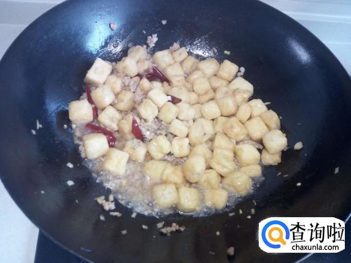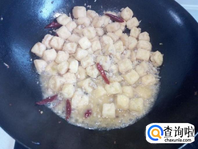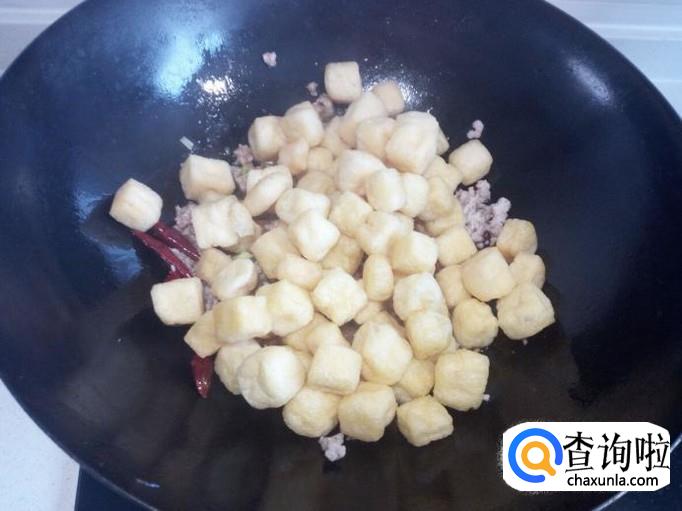随即放入豆泡略翻炒一下,然后放入少量的水,放少许盐,小火烧一会(慎重放盐,豆泡吃盐)。