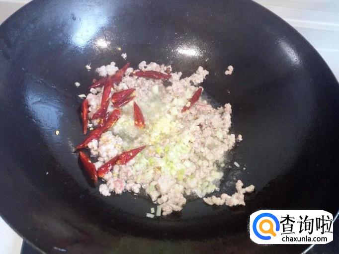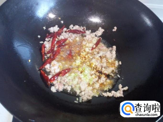 炒至肉末颜色微白,放入红干椒,葱,姜,蒜,翻炒。放入料酒,少许酱油。