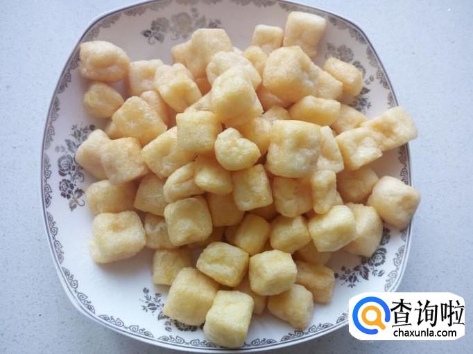 准备好豆泡。如果比较大的豆泡,用刀在中间切开,便于入味,我这是小豆泡,所以没切。