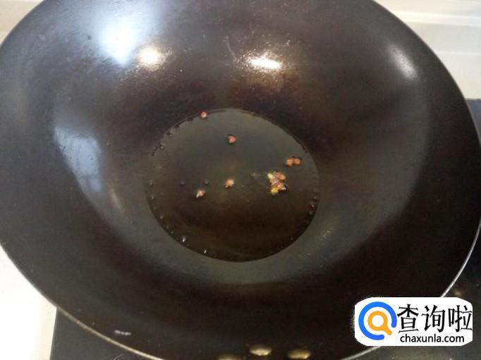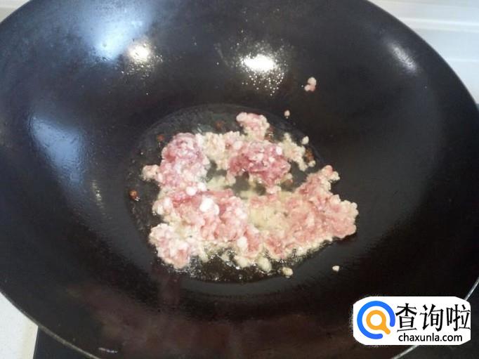 锅内放入油加热,油热后放入花椒爆锅,放入肉末翻炒。