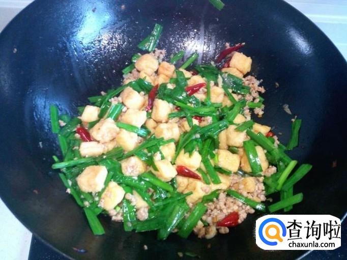 豆泡烧至两分钟的时间,把勾兑好的薄芡倒入锅中,芡汁粘稠后,放入韭菜转大火快速翻炒。