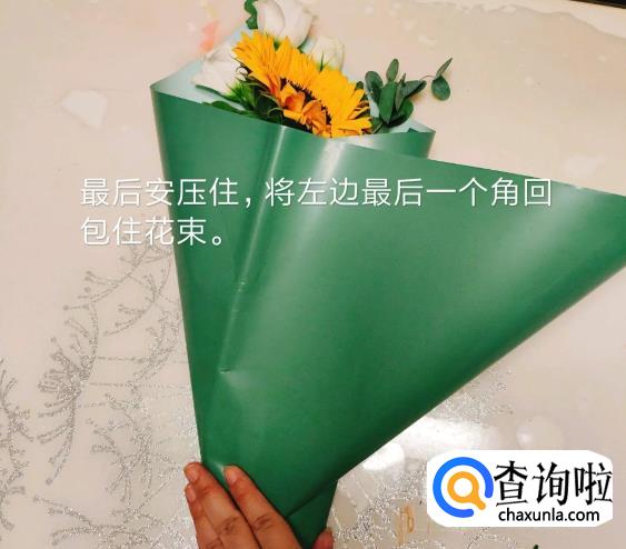 将右边包装纸回折,包裹住花束,将多余的角窝进花束后面。