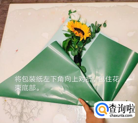 这种包法类似于小宝宝裹包被,纸张大小都可以用这种包法,如果想要花束稍微小一点,可以将最开始的包装纸整体裁小。包法相同,花束就会小一点。