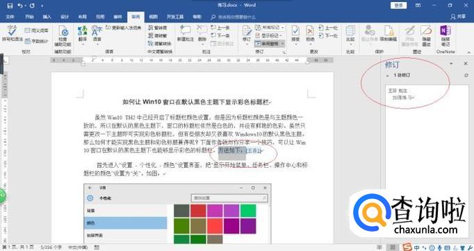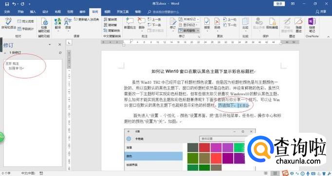 如图所示,文档编辑区左侧唤出"修订"对话框。拖动右侧垂直滚动条,选中批注进行修改。