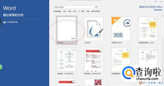 启动Word 2016文字处理应用软件,如图所示点击屏幕右侧新建空白文档。