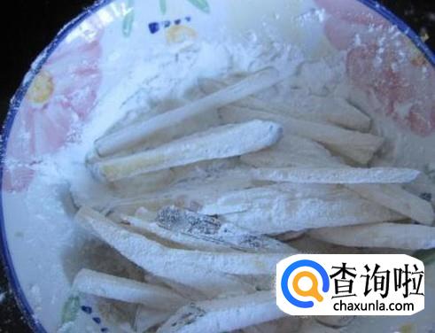 红薯切成条之后放进面粉堆里,没错,就是面粉,和炸薯条一样,直接撒上面粉不停的翻滚,让红薯条均匀的沾上面粉。