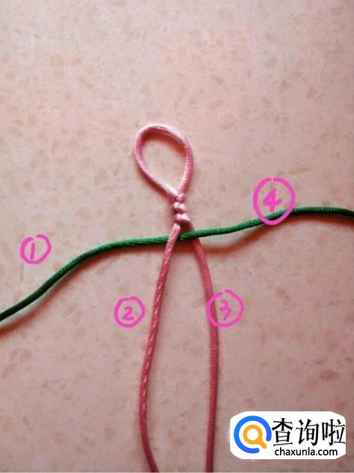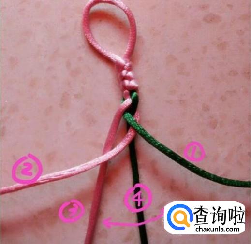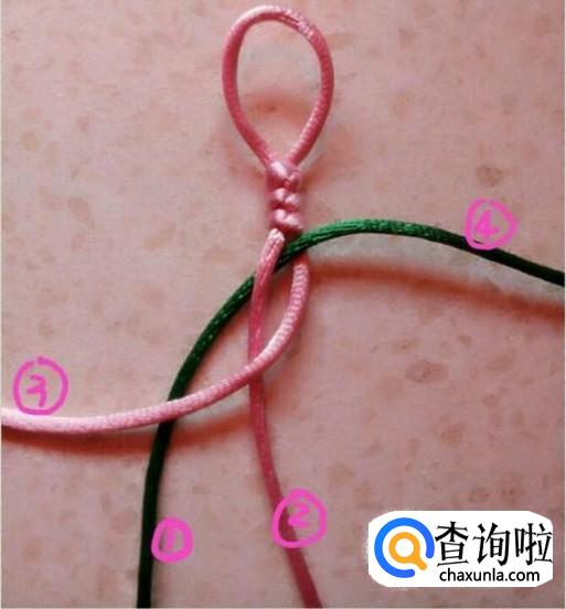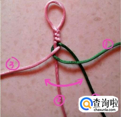 然后用3号绳压住1、2号线。这个时候就形成了粉绿交叉。