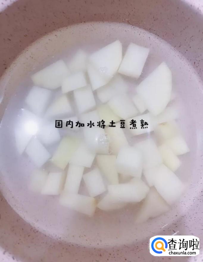 接着锅内加入适量的清水,待水烧开,倒入土豆煮熟,如下图所示。