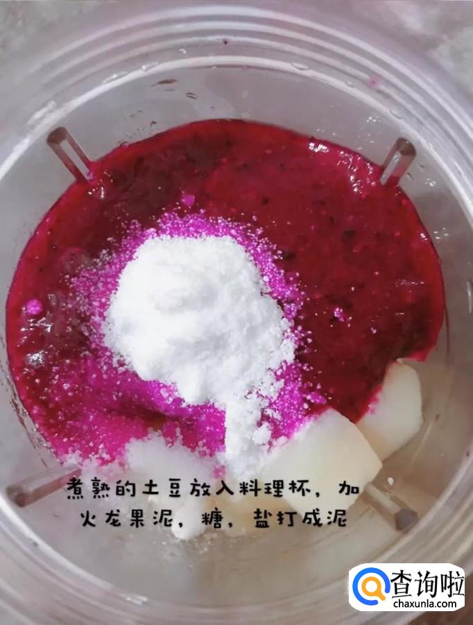 然后把煮熟的土豆导入料理机中,加入火龙果泥、糖和盐打成泥,如下图所示。