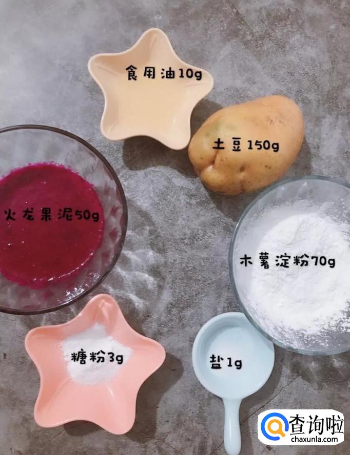 首先准备好所有要用到的食材,如下图所示。小贴士:火龙果泥50克,糖粉3克,盐1克,木薯淀粉70克,土豆150克,食用油十克。